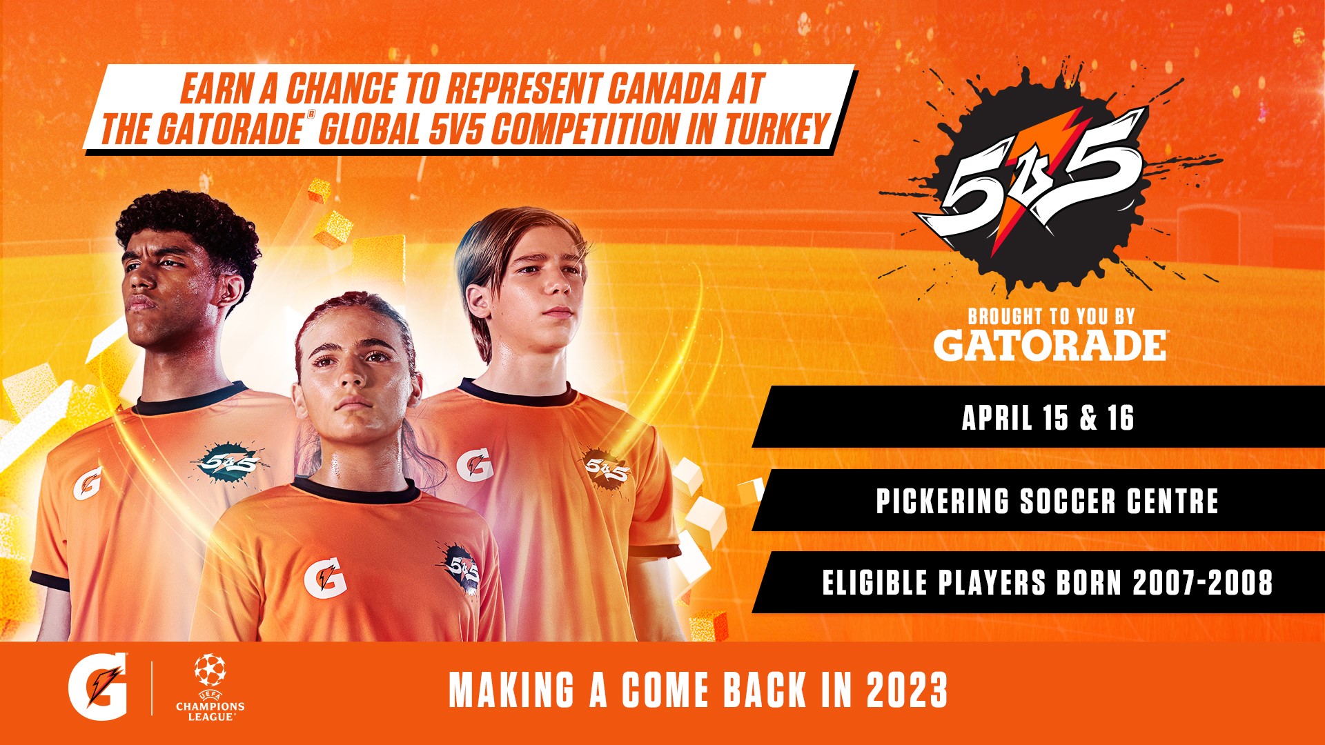 Staging a triumphant comeback after a three-year pandemic hiatus, this marquee event is in its third year in Canada. In this edition, the winners will represent Canada at the Gatorade 5v5 Global Final in Istanbul, Turkey in June 2023. The winners of the Global Finals will receive, for the entire team, tickets to the 2023 UEFA Champions League Final in Istanbul, Turkey, scheduled for Saturday, June 10, 2023.