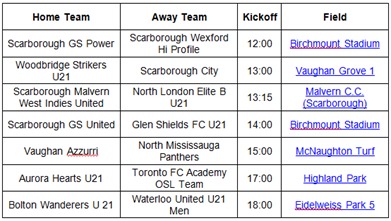 The U-21 men’s division is also in action this weekend with their first Ontario Cup games. There are seven games in total, with the winners moving on to the quarter-finals in July. The U-21 men’s games scheduled for Saturday, June 21 are listed below: