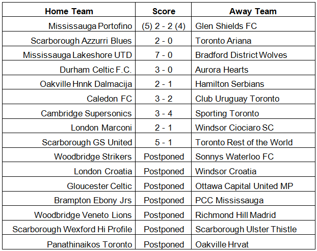 The nine games that did take place were not without drama. The Ontario Soccer League provincial level team, Hamilton Serbians, were upset by Oakville Hnnk Dalmacija by a score of 2-1 in a shocking result. Last year's Provincial and National champions from London Marconi had a close call against Windsor Ciociaro – but were able to come away with a tight 2-1 win.